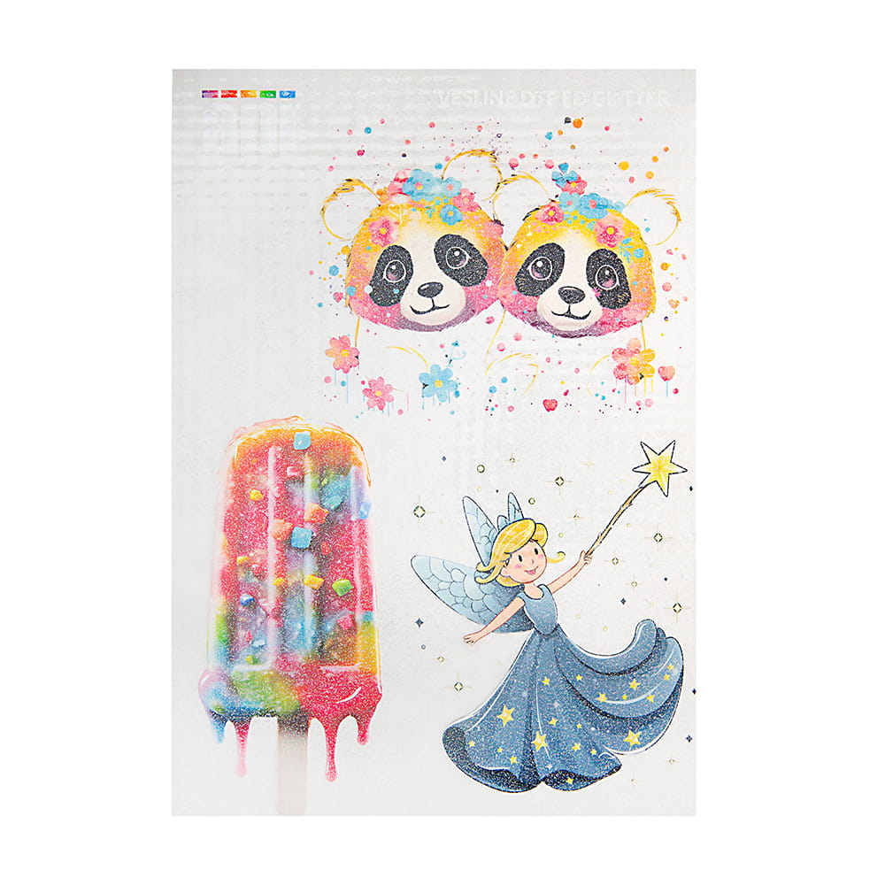 Folia Vesline DTF FD Glitter to wysokiej jakości folia DTF stworzona do produkcji nadruków DTF Premium. Umożliwia wykonywanie kolorowych nadruków z efektem brokatu na różnego rodzaju podłożach tekstylnych – idealna do personalizacji odzieży, toreb, czapek, akcesoriów tekstylnych i wielu innych dodatków.